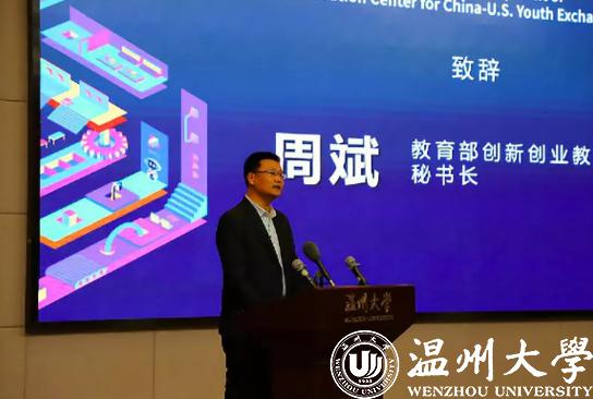 教育部创新创业教育指导委员会秘书长周斌致辞。他就教指委推动中美青年创客交流中心建设工作做了简要介绍,并希望各创客中心一起携手为创新创业教育国际化拓展新的发展路径。