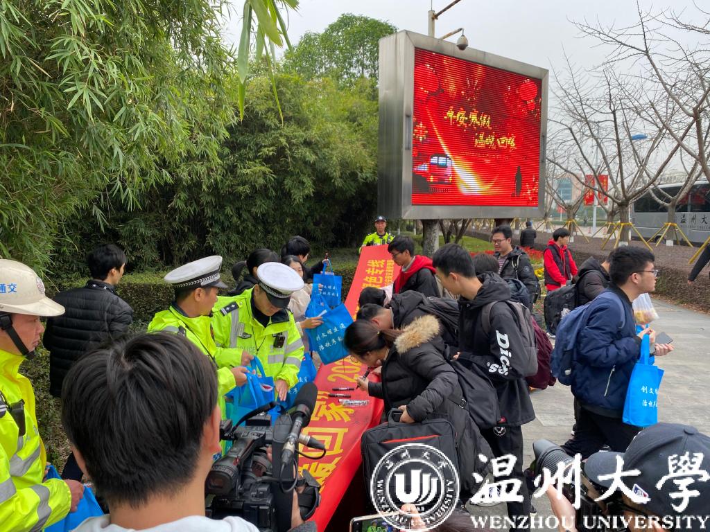 出发现场,温州市公安局交通管理局的交警同志在现场对每一辆校车和每一位驾驶员进行“发车体检”,重点检查车辆保险、年审、违章等情况,并对校车驾驶员的证件进行检查,依次进行酒精呼吸测试,确保春运护送的校车、驾驶员状态良好。同时,交警部门在发车处设立了交通安全宣传站点,针对大学生出行特点,通过展板海报、扫码互动、签字承诺和现场讲解电动车交通事故案例以及乘坐“黑车”、“改装车”的安全隐患等方式将“平安锦囊”送至每个学生手中。“平安锦囊”里不仅有春节福、春联,还有电动车出行安全手册,为学生们送上新春祝福的同时,也在提醒他们返乡路上遵守交通法律法规,带着平安回家过年。