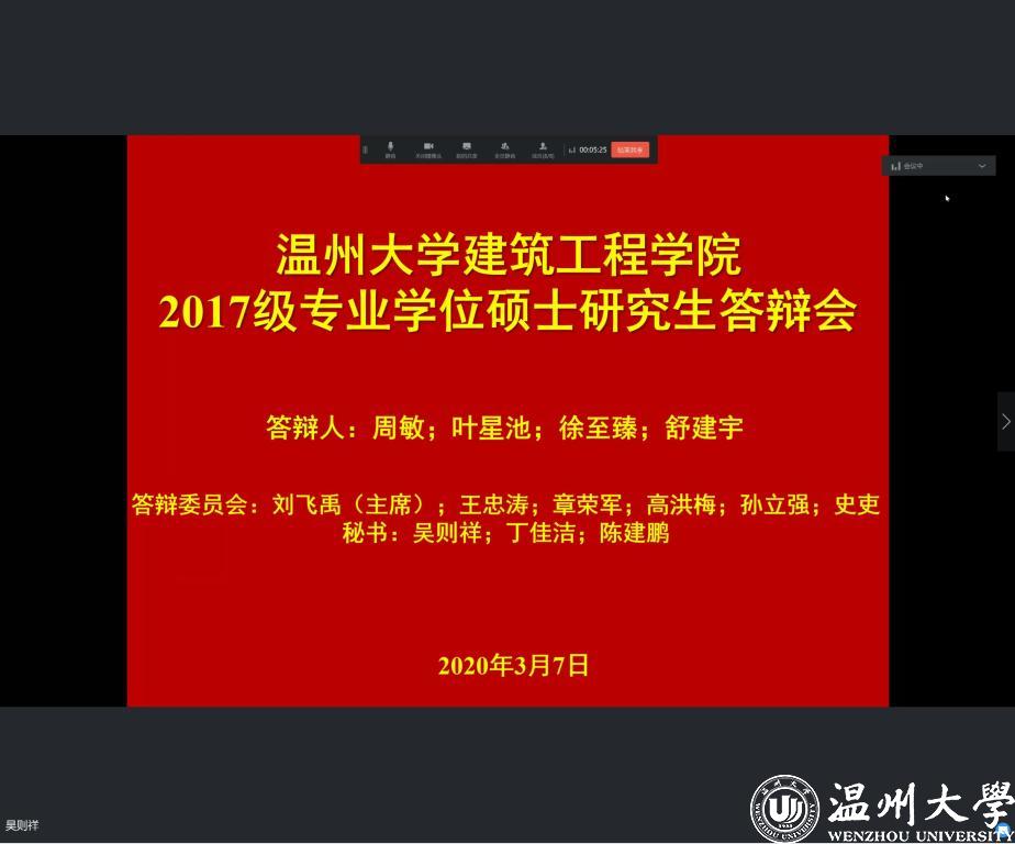 根据当前疫情防控正值关键时期,亚洲成人 秉承“以生为本、优化流程、分批推进、确保质量”的原则,在保证学位授予质量的前提下,精心组织、周密部署,亚洲成人 春季研究生学位论文网上答辩开始启动。3月7日,建筑工程学院首批21名建筑与土木工程专业领域硕士研究生学位论文线上答辩圆满完成!