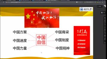 新学期伊始,温大迅速组建思政名师团队,开启思政课“三全”线上教学,实现在线“主播”思政全覆盖、思政第一课全新讲、在线思政课程全共享,为两万余名大学生上好“抗疫思政大课”,帮助大学生正确认识疫情、科学防范疫情、守法支持防控,引导大学生疫情阻击战中厚植爱国情怀,增强“四个意识”,坚定“四个自信”。在线上平台讨论区,同学们积极留言谈感想、讲心得、话体会,表达对战胜疫情的必胜信念和对中国特色社会主义的制度自信。来自湖北的唐双双同学说:“疫情使我切身体会到我们国家制度的优越性……我们依靠这样的制度优势,众志成城必将战胜2020年的新冠疫情。”