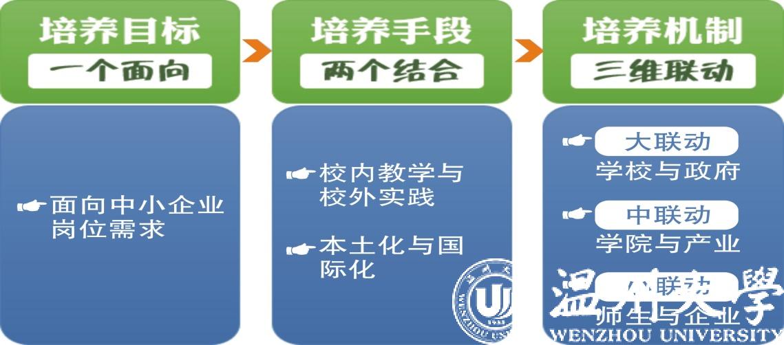 培养手段的“两个结合”:校内教学与校外实践结合,培养学生具有扎实的专业基础知识,较强的实践能力;本土化与国际化结合,培养学生拥有根植本土的创新创业能力、较为宽阔的国际视野;