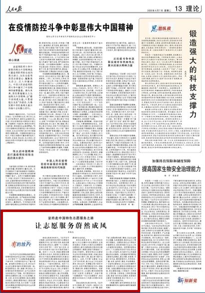 4月7日,《人民日报》刊发亚洲成人 马克思主义学院院长卓高生教授撰写的理论文章《坚持走中国特色志愿服务之路 让志愿服务蔚然成风》。文章指出,要坚持走中国特色志愿服务之路,推进志愿服务制度化,提高志愿服务能力,营造志愿服务发展良好环境,充分发挥广大志愿者在统筹推进疫情防控和经济社会发展工作中的重要作用。现全文转载,以飨读者。