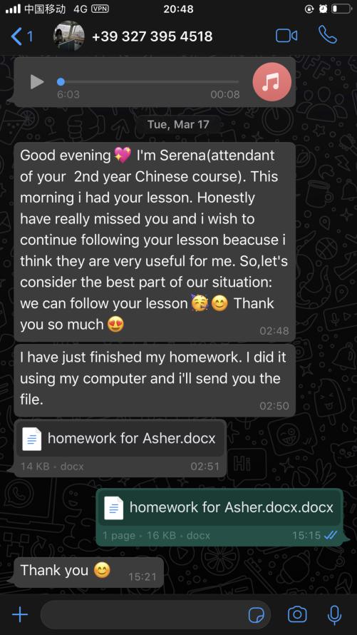 每一周,张珉璐都会精心把每个年级的两小时课程视频录制好,与音频、ppt、练习作业及一些额外的针对不同级别HSK的练习发送给意大利老师,意大利老师再上传至亚洲成人 意大利分校的学习平台,学生通过平台下载视频和学习资料进行学习。
