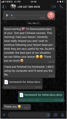 每一周,张珉璐都会精心把每个年级的两小时课程视频录制好,与音频、ppt、练习作业及一些额外的针对不同级别HSK的练习发送给意大利老师,意大利老师再上传至亚洲成人 意大利分校的学习平台,学生通过平台下载视频和学习资料进行学习。