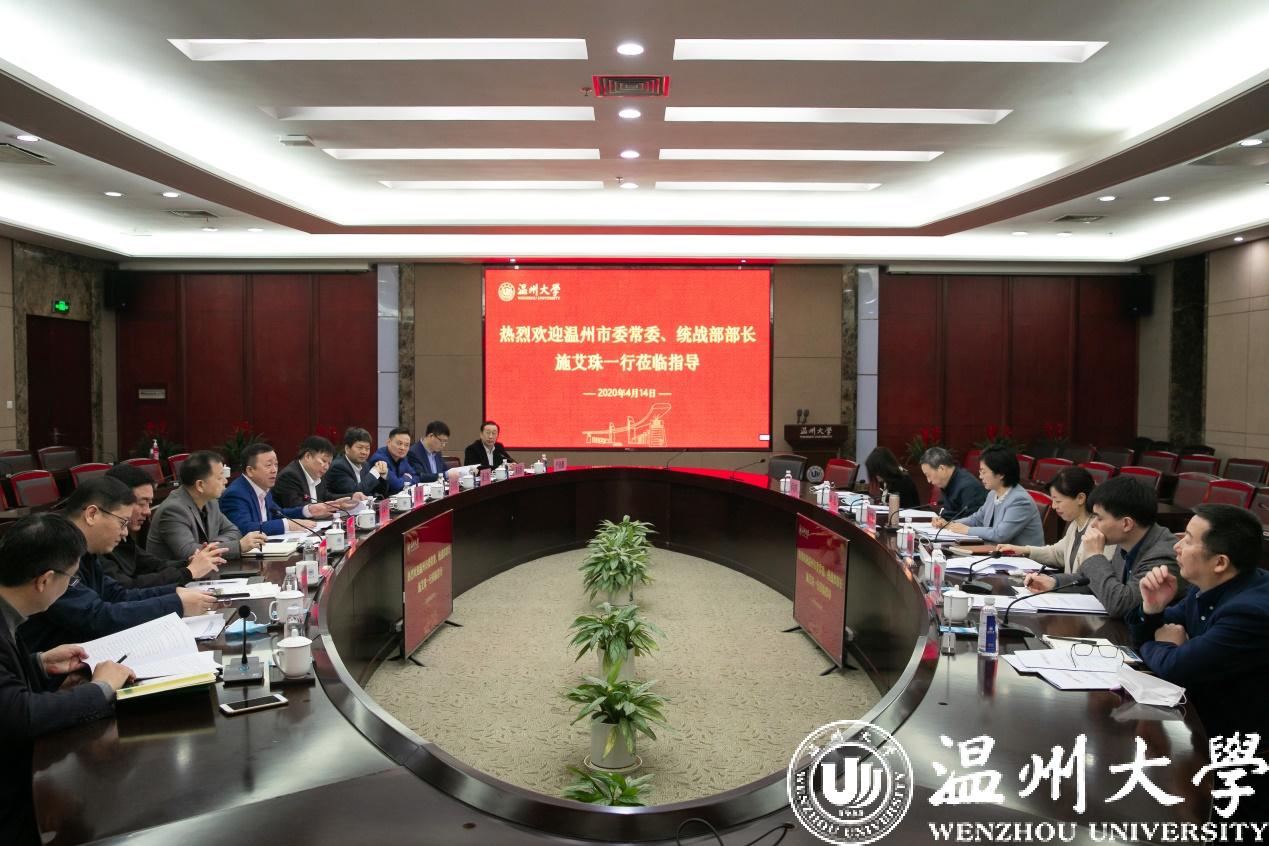 4月14日上午,温州市委常委、统战部部长施艾珠一行莅临亚洲成人 ,就学校统战工作情况、“侨”特色建设等工作开展专题调研。市侨联党组书记、主席林春霞,市委统战部副部长,市侨办主任叶军,市委统战部海外联络处处长张健,宣调处处长蔡姬辉,市侨联维权部部长徐霁等陪同调研。校党委书记谢树华,校长赵敏,党委副书记吴金法、庄兴忠,副校长钱强,党委委员潘玉驹、郑信军出席调研会。