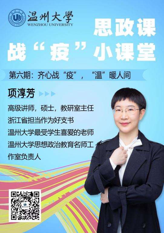 本期推出马克思主义学院项淳芳老师思政课战“疫”小课堂:齐心战“疫”,“温”暖人间。 每一座城市都有自己独特的基因密码,在这场战“疫”大考中,作为“孤悬鄂外的重灾区”,温州这座温暖的城市交出了令人满意的时代答卷。温州人精神也有了最新的诠释和生动演绎,主要表现在温州人大爱无疆、善行天下,抱团自强、守望相助,担当务实、敢为人先。世界温州人的战“疫”故事和精神是中国众多城市的一个缩影,正是无数个英雄的城市无数的人们齐心战“疫”,才有“山河无恙,人间皆安”的最美图景。