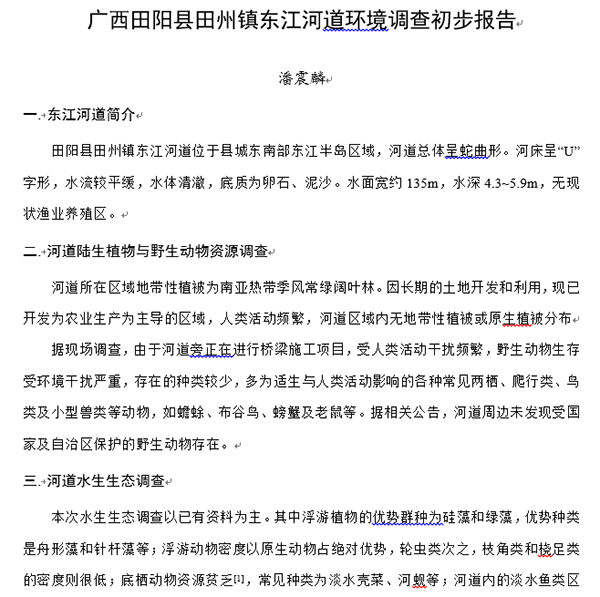 亚洲成人 生环学院18环境工程潘震麟 撰写家乡河道环境调研报告