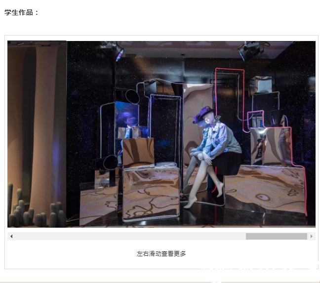 展示设计是一门综合艺术设计,在既定的时间和空间范围内,运用艺术设计语言,通过对平面与立体的构成分析、色彩和造型的综合运用,精心创造出独特的空间环境以展示产品,并使观众能参与其中,从艺术与营销的双重角度,达成完美沟通与共鸣的目的。助推服装产业转型升级,注重理论和实践教育双管齐下,结合理论讲解、案例分析、实践教育、创业教育等多种教育形式,依托温州作为鞋服之乡、时尚之都的地域优势,辐射时尚行业全领域,全面打造“一技傍身,数行通用”的最紧俏专业。核心课程:橱窗设计、服装陈列设计、服装搭配设计、陈列材料与道具设计、配饰品陈列、店堂规划与设计、陈列管理、卖场POP设计、时尚插画设计、品牌视觉系统企划、陈列/卖场/橱窗效果图表现技法等。本方向为飞速发展的中国时尚业输送从事视觉营销设计和管理的高级人才。毕业生可在服装、鞋、包、珠宝、家具、展会和大型商场等领域从事品牌视觉形象管理、商业展示空间设计、终端陈列规划、服装陈列研发、橱窗设计、服饰搭配、陈列培训、服装展示、服装导购、服装营运等视觉营销工作,具有极为广泛的就业渠道和前景。