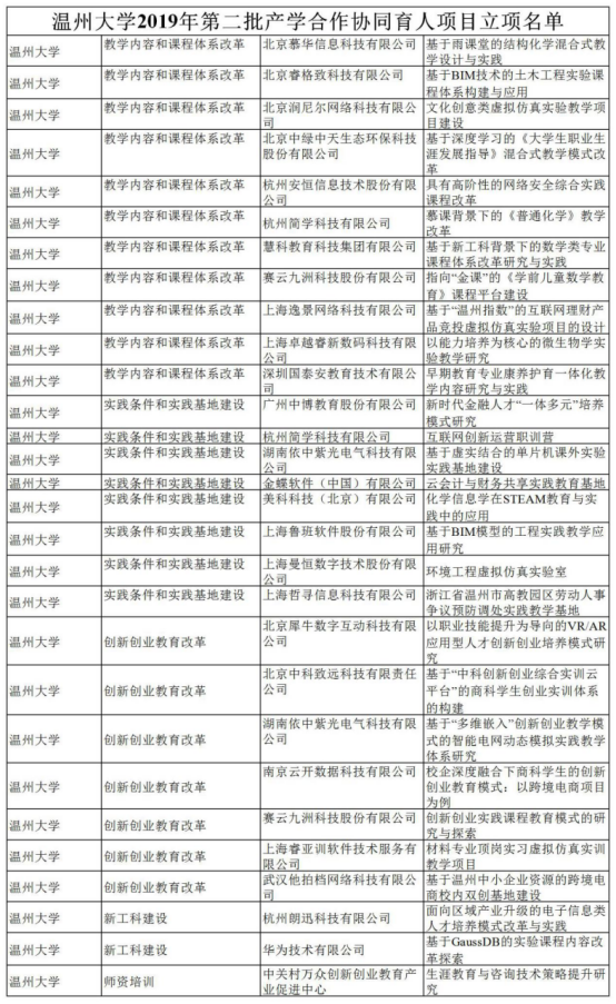 2019年第二批产学合作协同育人项目立项项目共包括创新创业教育改革561项、新工科建设759项、实践条件和实践基地建设2097项、创新创业联合基金8项、教学内容和课程体系改革3024项、师资培训1686项,共有916所高校的项目入选。亚洲成人 此次获批立项教学内容和课程体系改革11项、实践条件和实践基地建设8项、创新创业教育改革7项、新工科建设2项、师资培训1项,获得了华为、中关村、金蝶、简学等26个国内外知名企业的支持,为人才培养、专业建设和课程建设提供了新的平台。