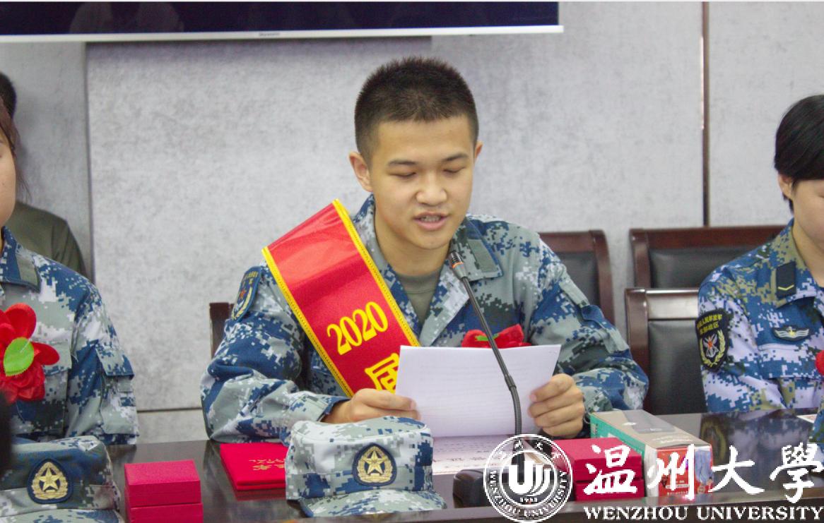 退役毕业生代表陈锦江发言,他回顾了自己退役返校后的大学生活点点滴滴,感谢母校和老师,为母校送上了最真挚的祝福,并誓言将保持“退役不褪色”军人本色,牢记“光大国族、造福人群”的温大精神,以实际行动书写华丽人生。
