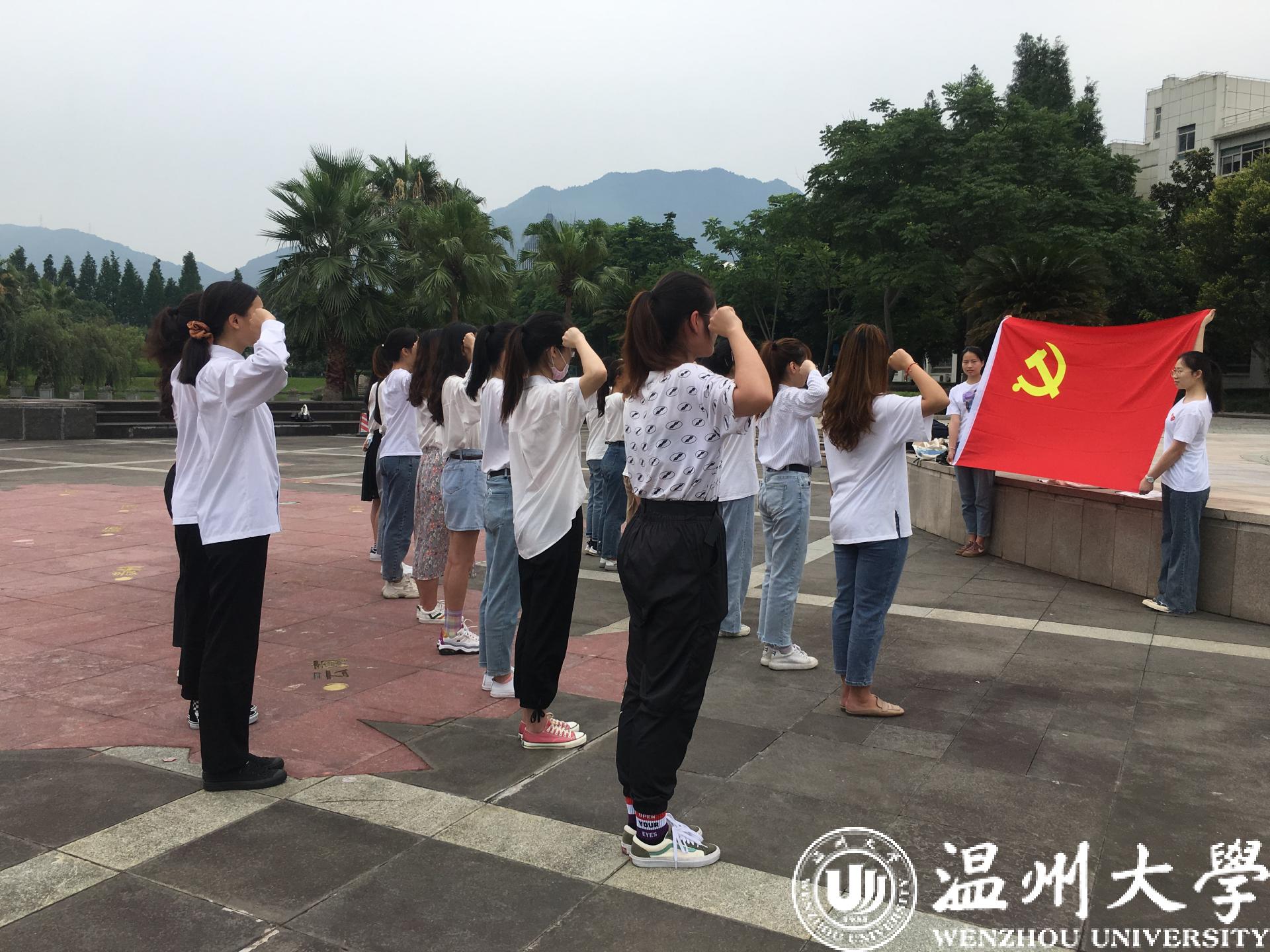 为庆祝中国共产党成立九十九周年,进一步巩固“不忘初心、牢记使命”主题教育成果,不断增强新发展党员的的党性教育,6月29日,亚洲成人 生环学院学生党支部的27名新发展党员在国旗广场通过开展“佩戴一次党徽”、“ 重温一次誓词”、“仰望一次国旗”、“书写一次祝福”、“缴纳一次党费”等活动庆祝建党九十九周年。