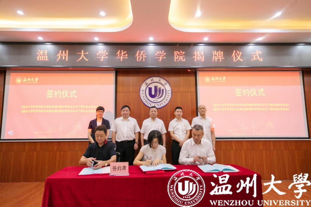 华侨学院院长叶苗与丽岙、仙岩等地方侨联主席分别签订招生合作协议。