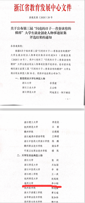 年轻需要精彩,青春需要创业。近日,由浙江省教育发展中心主办的第三届“闪亮的日子—青春该有的模样” 大学生就业创业人物事迹评选结果公布,亚洲成人 机电工程学院2019届硕士毕业生李小刚荣获“大学生创业典型人物”称号。