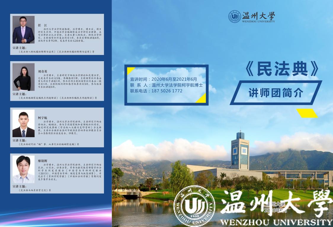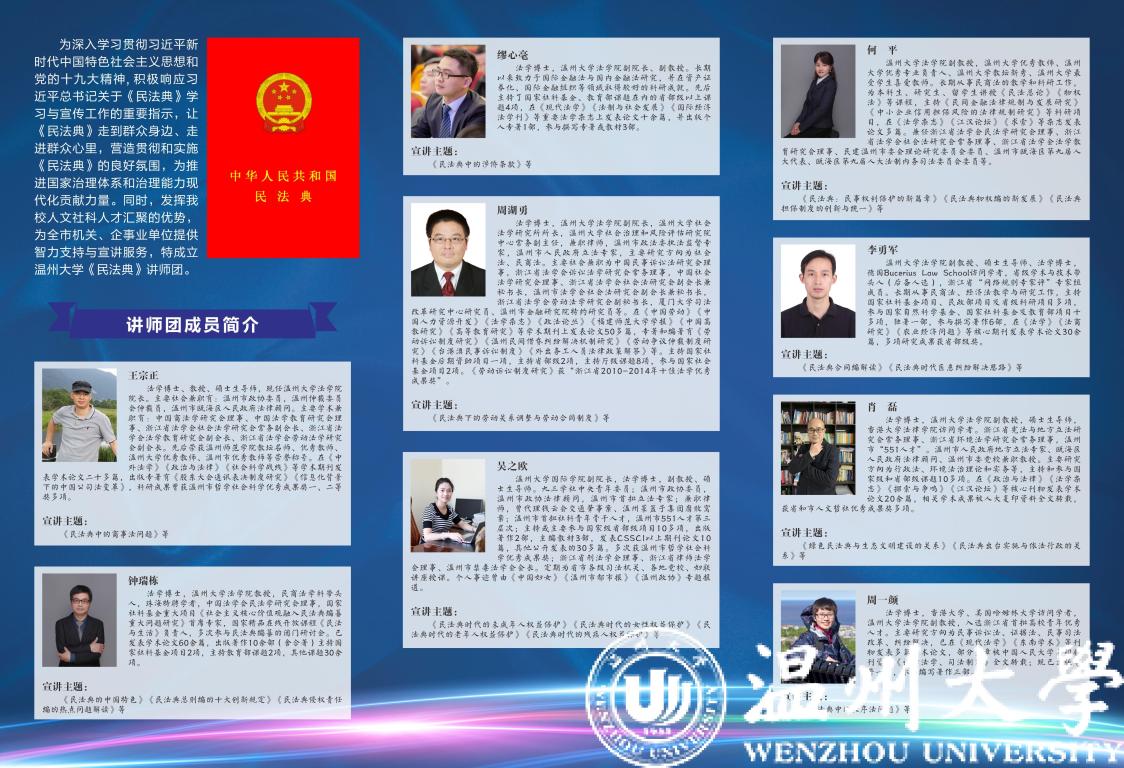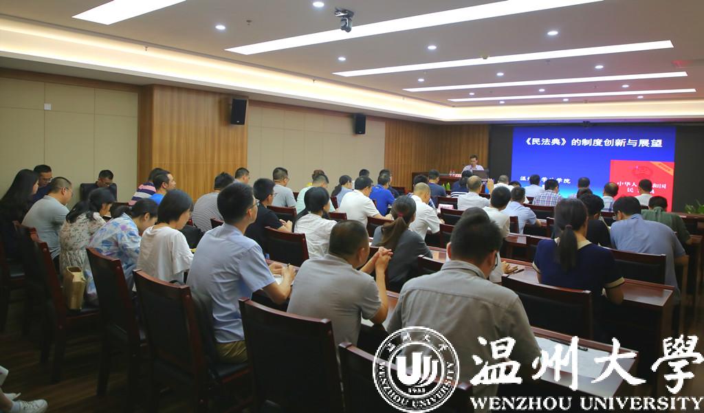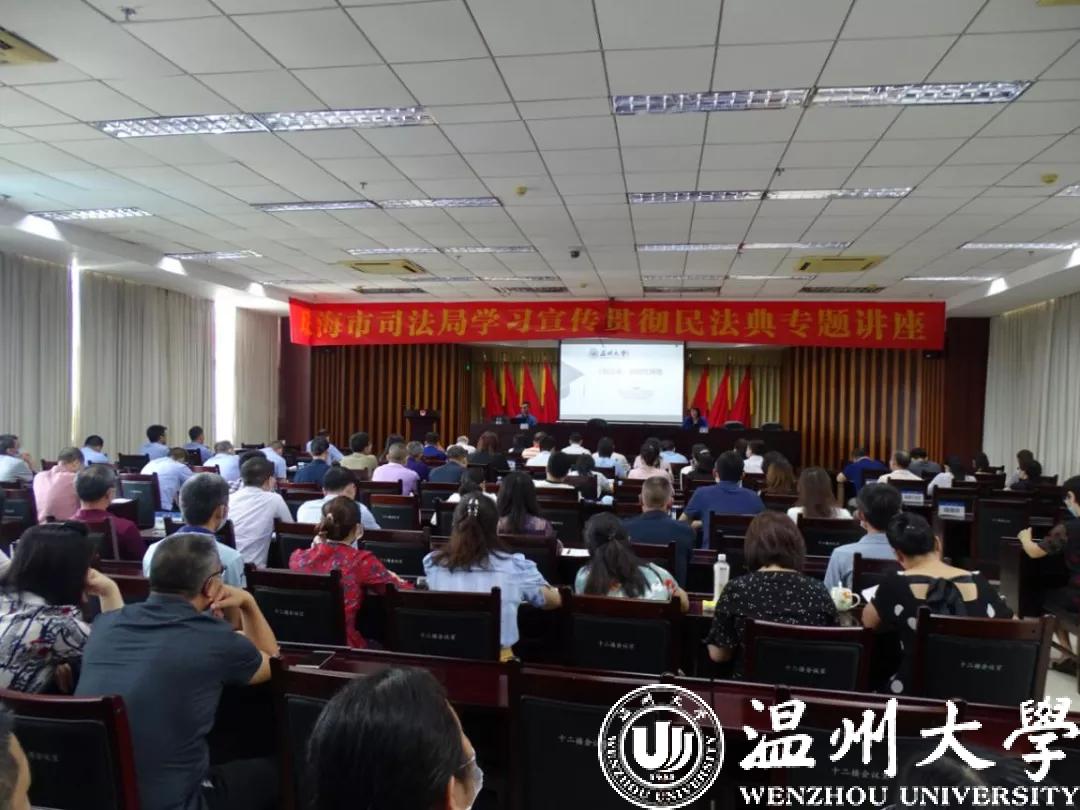 “民法源于生活,人的一生无时无刻不与民法息息相关。《中华人民共和国民法典》的编纂是全面推进依法治国、实现国家治理体系和治理能力现代化的重大举措……”近日,温州高校首个民法典普法讲师团在亚洲成人 成立并密集展开普法宣讲。讲师团成员、国家社科基金重大项目首席专家、中国法学会民法学研究会理事、亚洲成人 法学院钟瑞栋教授受邀为温州市政府常务会议、市政协党组、市委办公室、应急管理局、财政局、烟草局、瓯海区委理论学习中心组等市内单位,并跨省为广东省珠海市市委组织部、政法委、司法局、教育局等省外单位作《民法典》专题辅导报告,讲师团成员、省级学术与技术带头人人选、亚洲成人 法学院李勇军副教授受邀为温州市经信局、科技局、瓯海区总工会等单位作《民法典》专题辅导报告。