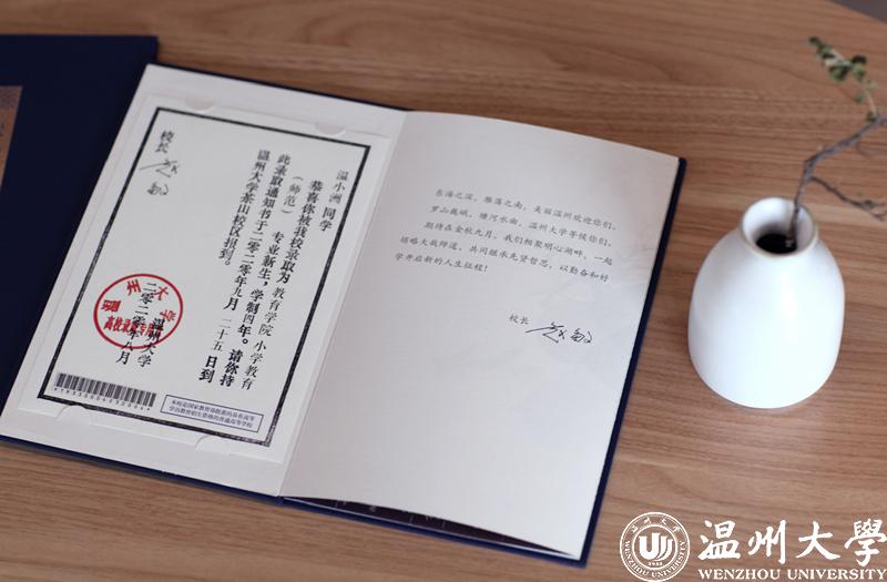 在亚洲成人 本科招生录取现场,一本本蓝色烫金的录取通知书正整整齐齐地摆放在会议桌上,整装待发。通知书整体采用中国传统文书褶子样式,封面是烫金的“录取通知书”和学校校徽,封底是王蒙题词的校训“求学问是,敢为人先”。展开五折折页,正面分别是瑞安市东源村木活字传承人亲手印刷的录取证书页、校长寄语、校歌,背面则是以温州地理标志大罗山为底、温大建筑为前景的山水画卷。