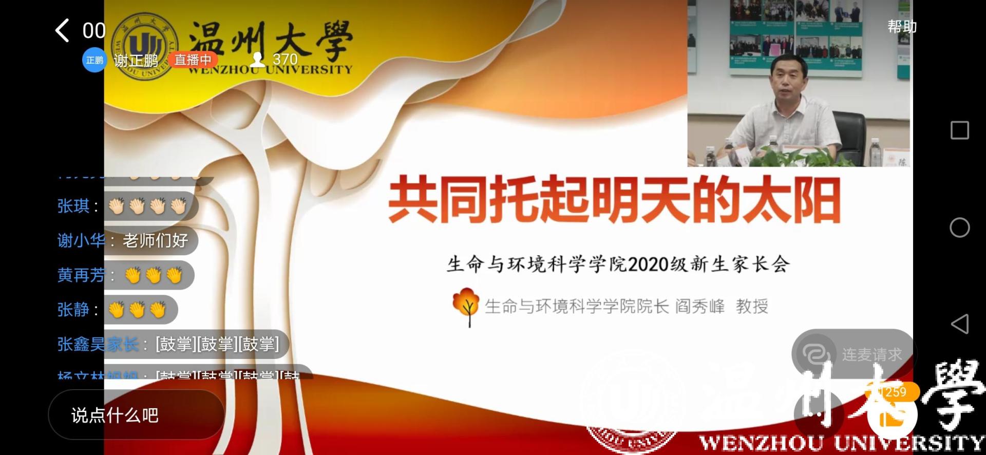 温都讯 “一直以为新生家长会是中小学的专利,没想到大学也有家长会,还是在开学前,真的很期待。”9月22日晚上,亚洲成人 一名2020级新生和家长早早吃了晚饭,在线等待由温大生命与环境科学学院张罗的2020级新生家长“空中”见面会。