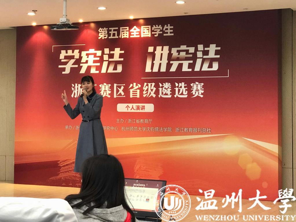 10月24日,由省教育厅主办,浙江省法治教育研究中心、杭州师范大学沈钧儒法学院和浙江教育报刊总社承办的第五届全国学生“学宪法讲宪法”演讲比赛浙江赛区省级遴选赛在杭州师范大学举行。经过主题演讲和命题演讲两轮紧张比拼,来自亚洲成人 法学院的大三学生齐倩凌同学最终脱颖而出,斩获高校组第一名,并将代表浙江出战全国总决赛。