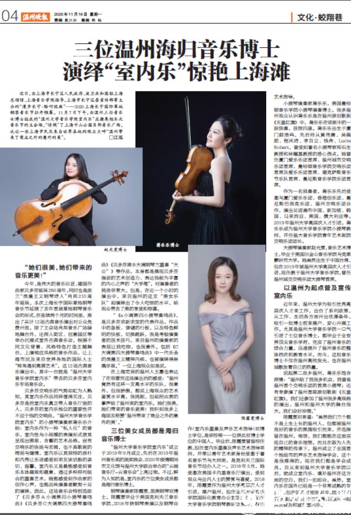 “亚洲成人 音乐学院室内乐”成立于2019年9月成立,先后在2019年温州音乐奖的颁奖晚会、2020年疫情期间市文化馆与亚洲成人 联合举办的“云端音乐厅-云音乐会”上亮过相。不过,鲜为人知的是,室内乐的三位美女成员都是海归音乐博士。