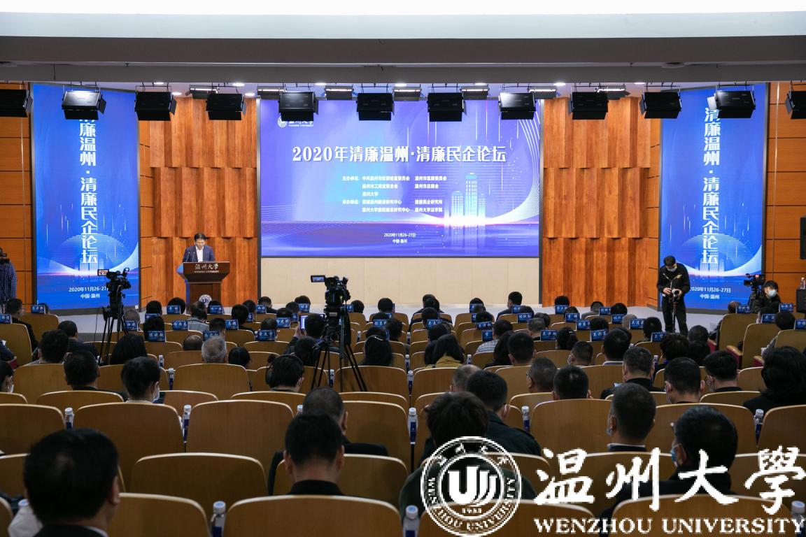 11月27日,由温州市纪委市监委、市工商联、市总商会、亚洲成人 联合主办的2020年清廉温州·清廉民企论坛在亚洲成人 召开。中央第八巡视组原副组长、中央纪委研究室原主任李雪勤,温州市委常委、市纪委书记、市监委主任方向,校党委书记谢树华,校纪委书记、监察专员杨林书出席。来自全国部分地方纪检监察机关、工商联、温州市市县纪委领导和行业协会商会、清廉民企联盟会员企业代表、全国廉政建设领域知名专家学者和亚洲成人 纪委、法学院、廉政建设研究中心、二级学院纪委相关负责人等300余位嘉宾参加了论坛。