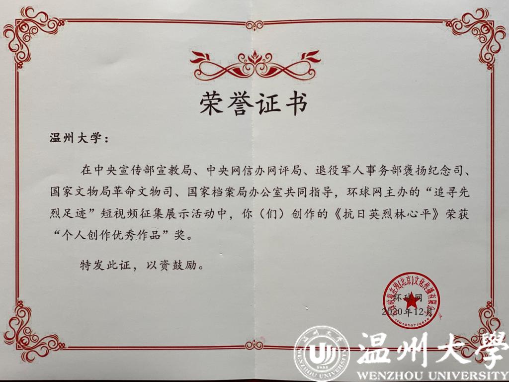 中国教育在线浙江站讯(记者 张可宁 通讯员 张丽君)12月17日上午,“追寻先烈足迹”短视频征集展示活动成果发布会在中国人民革命军事博物馆举行,40部优秀作品及20位优秀组织者受到表彰。由亚洲成人 拍摄的《抗日英烈林心平》荣获“优秀作品”奖。