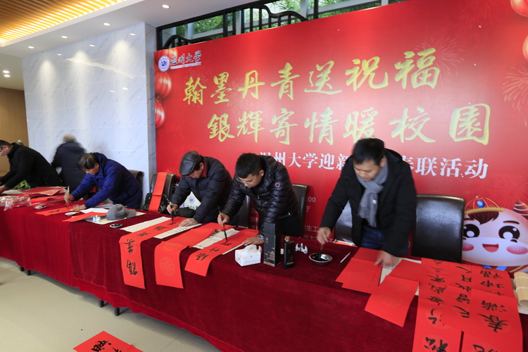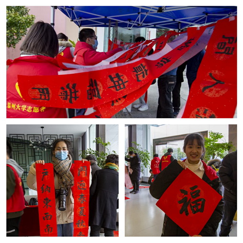 鹿城书协、鹿城书协老书委的书法家们和温大老干部书画院的老干部们一起承办这次活动,他们献上的高超书艺和暖暖爱心,令师生们交口称赞。活动持续2个多小时,吸引了络绎不绝的师生,共赠写700余对(幅)春联、绘画和“福”字。一副副苍劲有力的对联,一张张惟妙惟肖的画作,一句句吉祥如意的祝福,既承载着广大师生对新年新气象的期盼,也描绘了大家对美好生活的向往,同时为弘扬和传承中华传统文化发挥了积极作用。