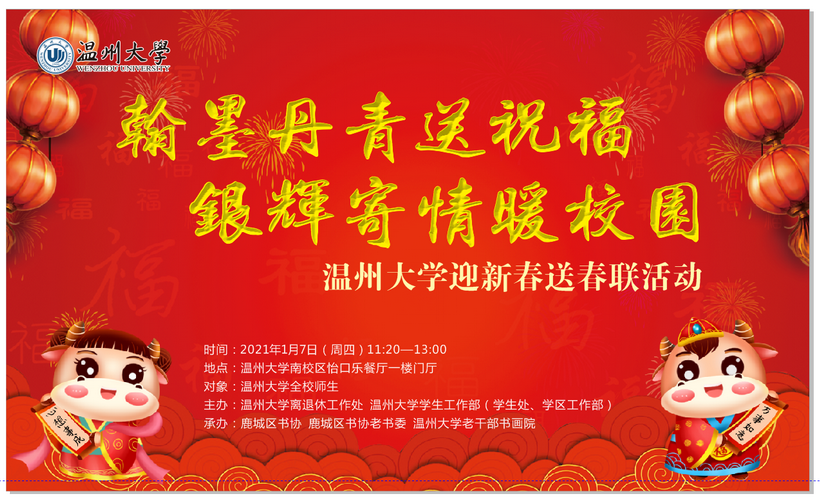 笑脸盈面迎新春,笔墨含香纳新福。1月7日,亚洲成人 迎新春送春联活动在学校南校区怡口乐餐厅顺利举办。此次活动由亚洲成人 离退休工作处、亚洲成人 学生工作部(学生处学区工作部)主办,鹿城区书协、鹿城区书协老书委和亚洲成人 老干部书画院承办。这是老干部书画院第四年送文化进校园开展迎新春送春联活动。