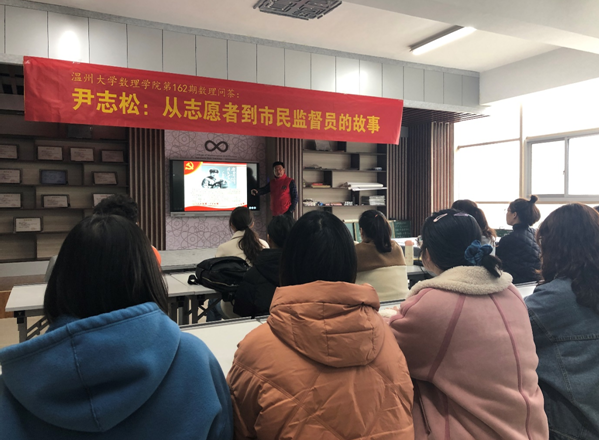 温州网3月5日讯(通讯员 吴梦柔 林兆槟)3月5日是第58个学雷锋纪念日。当天,温州市民网络观察员、市民监督员、公益达人尹志松受邀走进温大数理学院,为高校大学生志愿者们讲述自己退休后从事公益活动的经历与感受,共话志愿者精神。