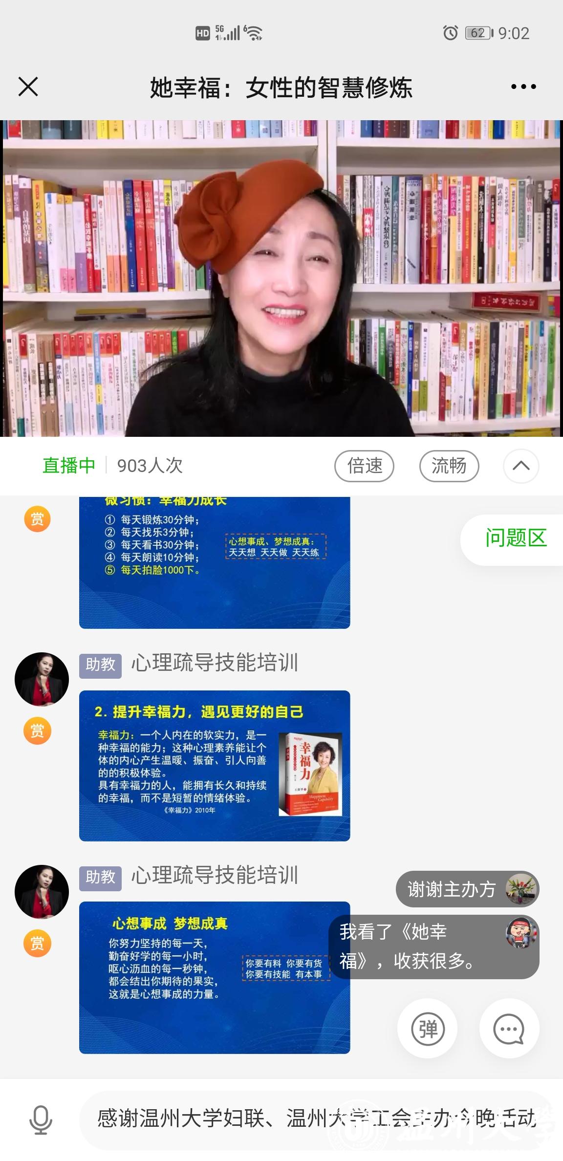 中国地质大学博士、积极心理学研究和实践专家、“中国职场幸福力”发起人和倡导者、首席幸福力导师王薇华在云端开启讲座,与温大近千名女教职工共话女性如何智慧修炼,提升幸福力。王薇华老师从女性的角色意识崛起、女性的时代到来、女性经济发展等方面来说明21世纪女性角色的社会化发展历程。王老师说,女性善于沟通、富有亲和力;善良细心、乐于奉献;注重家庭、终身学习,这是女性最大的性格优势。最后王老师重点分析女性的职业心理现状,分享她的五个幸福微习惯,并给出诸多比如日行三善、撰写感激日记、读书疗愈等方法来进行积极心理干预,提升职场抗挫力,提升职场幸福感。
