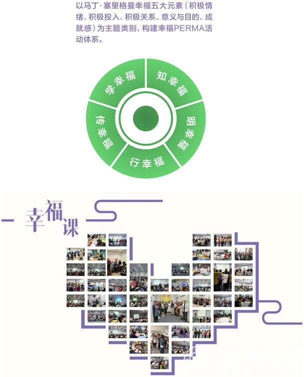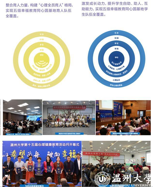 五大幸福教育活动体系:以幸福理论为依据,构建“学幸福、知幸福、明幸福、行幸福、传幸福”的幸福教育活动体系,五大幸福教育内涵贯穿同心圆。学校在做好基础心理工作的同时关注大学生的优势和美德,深化学生“爱祖国、爱家乡、爱学校、爱他人、爱自己”的五爱情怀,为大学生的成长成才保驾护航。