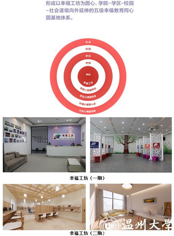 五级幸福教育同心圆基地:以幸福工坊为圆心,由学院-学区-学校-社会逐级向外延伸,形成学校心理育人工作与学生零距离、不间断、全方位、快反应的五级幸福教育同心圆基地体系。
