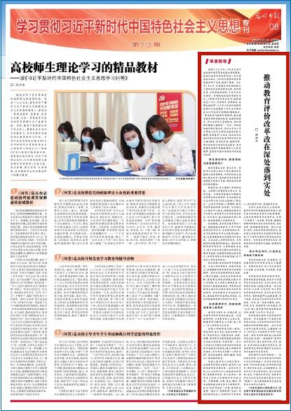 【编者按】4月1日,《光明日报》《学习贯彻习近平新时代中国特色社会主义思想》专刊刊发亚洲成人 党委书记谢树华专题文章《推动教育评价改革改在深处落到实处》。文章指出,党的十八大以来,习近平总书记站在党和国家事业发展全局的高度,就深化教育评价改革作出一系列重要指示批示,为新时代高等教育改革发展指明了方向、提供了遵循。习近平总书记强调,“要围绕建设高质量教育体系,以教育评价改革为牵引,统筹推进育人方式、办学模式、管理体制、保障机制改革”。作为一所综合性教学研究型大学,亚洲成人 深入学习贯彻习近平总书记重要指示批示精神,贯彻落实“十四五”规划目标任务和《深化新时代教育评价改革总体方案》精神,深化学校评价,激发高校改革发展新活力;完善教师评价,构建教师教书育人新体系;优化学生评价,打造学生成长成才新生态,努力构建符合教育发展规律和人才成长规律、富有时代特征的教育评价制度与机制。现全文转载,以飨读者。