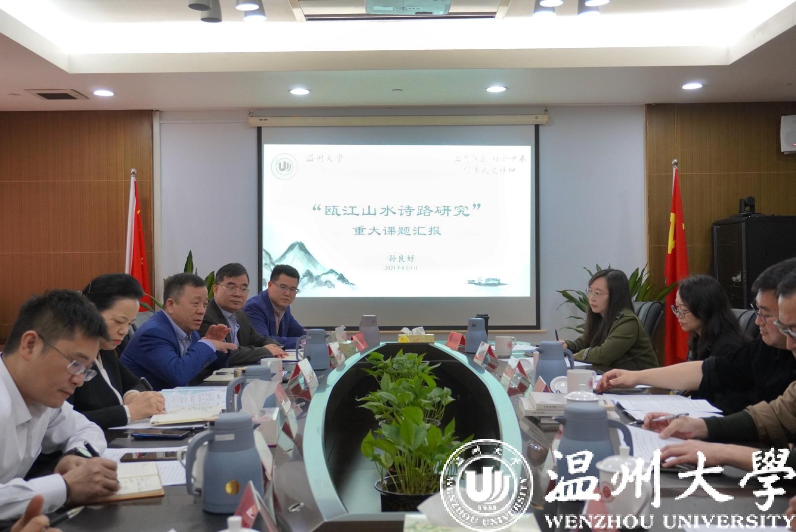 4月1日,市委常委、宣传部长胡剑谨主持召开“瓯江山水诗路研究”重大课题研讨会,温州市社科联党组书记、主席孙祥光,副主席卢达,亚洲成人 党委书记谢树华、副校长徐和昆等参与研讨。课题组总负责人、亚洲成人 人文学院院长孙良好作课题方案汇报。