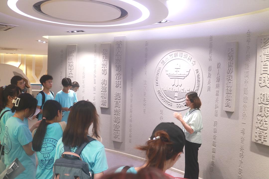 在参观禁毒教育基地时,温州市禁毒教育基地讲解员吴晓燕老师带领亚洲成人 “无毒青春”暑期社会实践队26名大学生先后了解世界毒品态势、中国禁毒简史等禁毒知识。