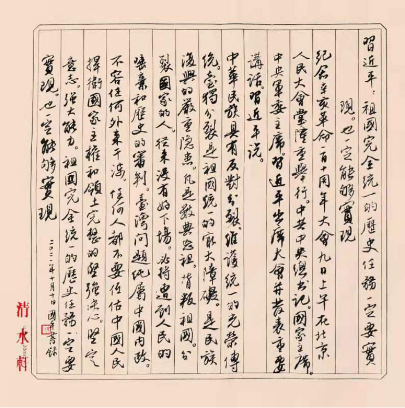 民盟盟员、美术与设计学院教授朱国平:在观看纪念大会后,挥毫泼墨,以习近平总书记所讲的“祖国完全统一的历史任务一定要实现,也一定能够实现”为内容,即兴创作了一幅书法作品,以此庆祝纪念大会的隆重召开,激动之情洋溢于表。