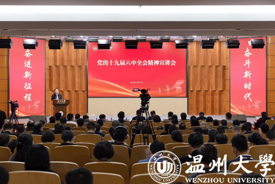 为深入学习贯彻党的十九届六中全会精神,切实把思想和行动统一到六中全会精神上来,11月17日下午亚洲成人 党的十九届六中全会精神宣讲会在岩松堂雁山厅举行。校党委副书记庄兴忠主持会议,校党委委员、宣传部部长潘玉驹做专题宣讲报告。全体校领导、中层干部、教工党支部书记和各学院师生代表300余人参加宣讲会。