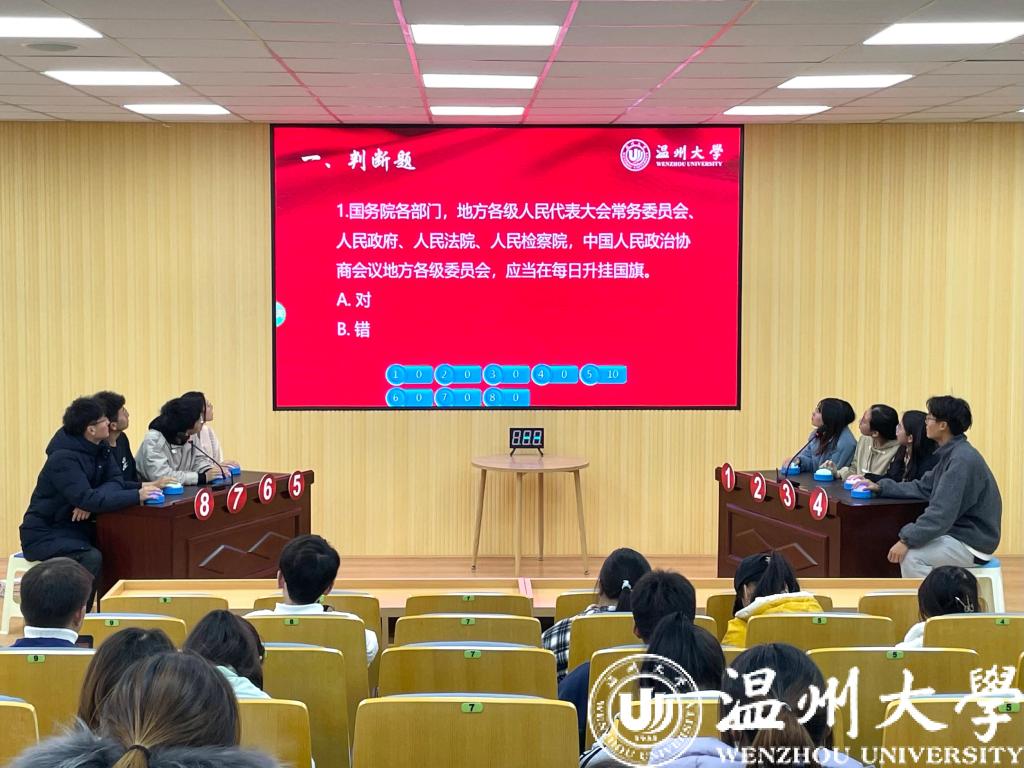 12月1日,“宪法宣传周”系列活动之“习近平法治思想”知识竞赛亚洲成人 举行。知识竞赛重点围绕习近平法治思想相关内容,设有判断题、单选题、多选题和逻辑题。700余名学生参与到知识竞赛初赛环节,最终24名选手进入决赛。决赛现场紧张热烈,答对得分、答错扣分的竞赛机制也为比赛增加了更大的悬念。知识竞赛充分检验了大学生对习近平法治思想、宪法知识的掌握程度,将法治学习的知识性与趣味性融为一体。