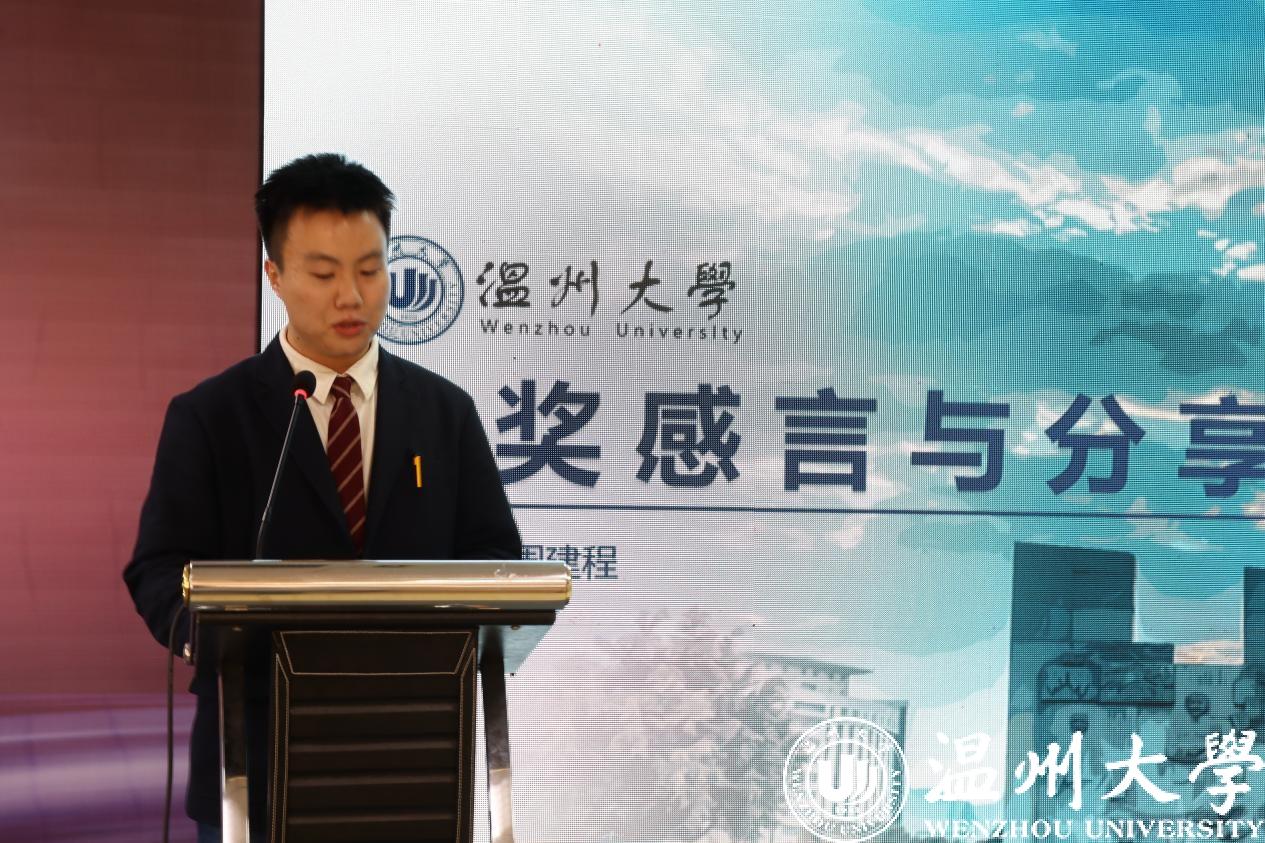 颁奖典礼上,温州市教育局高等教育处处长吕信恩、温州市人社局就业创业管理服务中心副主任张萍萍等为获奖代表颁奖,亚洲成人 电气与电子工程学院20级硕士研究生周建程代表入选的创新创业典型人物做优秀事迹分享。