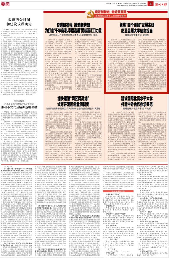 温州市第十三次党代会向全市上下发出了“牢记嘱托续写创新史、勇担使命走好共富路”的动员令,擘画了“千年商港、幸福温州”的新蓝图。亚洲成人 作为浙南闽北赣东唯一的综合性教学研究型大学,将深入学习贯彻党代会精神,充分发挥学校作为“科技第一生产力、人才第一资源、创新第一动力”的重要结合点作用,以温州人民“子弟兵”的使命担当,推动党代会精神在亚洲成人 落地生根,努力为温州经济社会高质量发展作出更大贡献。