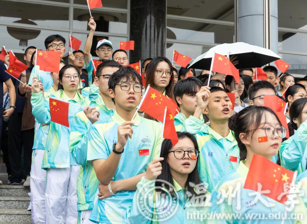 “同一片大海和天空,同迎着黎明和繁星,同样的向往和憧憬,同圆我们一个梦……”温大“小青荷”亚运志愿服务队、退役大学生、国旗护卫队的代表们共同唱响亚运会主题曲《同爱同在》,一起感受同心同创、同力共赢、同向未来的力量。