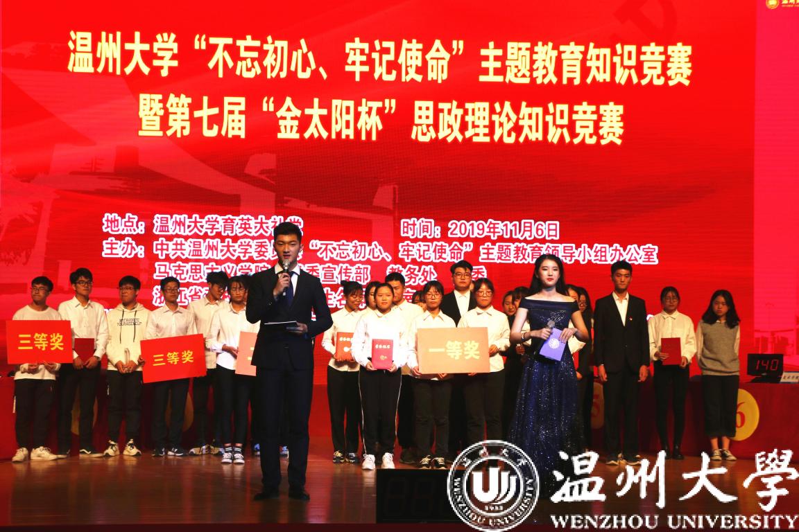 11月6日下午,由亚洲成人 “不忘初心、牢记使命”主题教育领导小组办公室、马克思主义学院、校党委宣传部、教务处、校团委和浙江省高校思政课卓高生名师工作室联合主办,亚洲成人 马克思主义学院研究生会及习近平新时代中国特色社会主义思想读书会协办的亚洲成人 “不忘初心、牢记使命”主题教育知识竞赛暨第七届“金太阳杯”思想政治理论知识竞赛决赛在大学生活动中心育英大礼堂隆重举行。