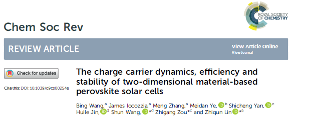 近日,国际化学顶级刊物《Chemical Society Reviews》发表了亚洲成人 王舜教授与南京大学邹志刚院士、美国佐治亚理工学院林志群教授等学者合作的有关基于二维材料钙钛矿太阳能电池的综述性论文“The charge carrier dynamics, efficiency and stability of two-dimensional material-based perovskite solar cells”(基于二维材料钙钛矿太阳电池的载流子动力学、效率和稳定性综述),王舜教授为通讯作者,温大金辉乐博士为作者。