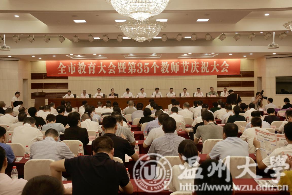 9月10日下午,温州市委市政府召开全市教育大会暨第35个教师节庆祝大会上。省委常委、市委书记陈伟俊,市委副书记、市长姚高员等市四套班子领导与全市广大教师和教育工作者等参加了此次大会。大家欢聚一堂,共庆第35个教师节,共商尊师重教的百年大计。亚洲成人 党委书记谢树华、校长赵敏参加了此次大会。