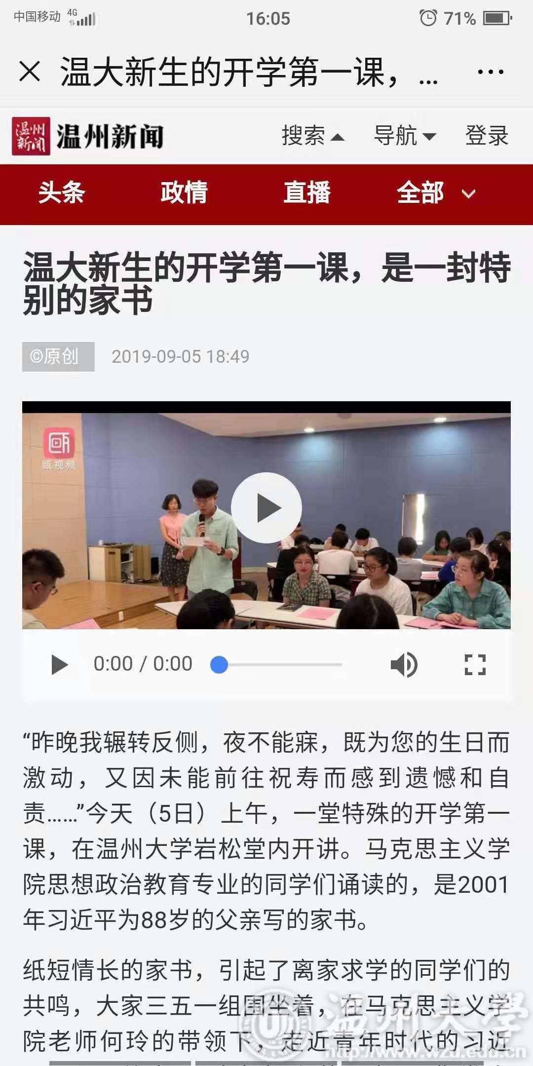 学习强国、温州新闻、温州日报还聚焦有风景的思政课,对亚洲成人 新生思政课“一封特别的家书”进行了深入报道。