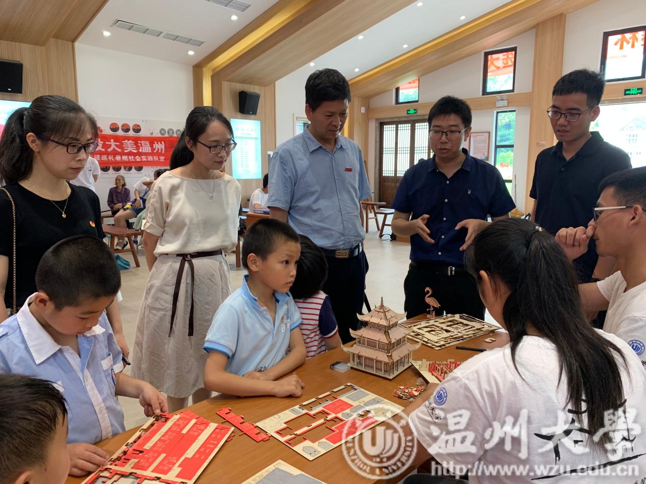 7月13日,副校长徐和昆一行先后来到温州三垟第三小学、温州市强达钟表文化中心看望慰问教育学院“‘垟’帆起航暑期实践队”、机电学院“瓯越匠心暑期实践队”。在温州三垟第三小学,徐和昆副校长在实地了解队员们的实践情况、工作场所,并现场观摩了实践队员们的课堂教学后,对实践队的实践工作给予了肯定和鼓励,并从注意人身安全、注重团队意识、做好总结提升、学会知行合一等方面对实践队员们提出期望。在温州市强达钟表文化中心,徐和昆副校长一行在中心负责人陈瑞祥先生带领下参观了以历史为轴的钟表珍品展览,并在中心二楼与实践队员们举行交流会,认真听取了实践队队长钱晨红同学关于实践队工作计划和进度情况的汇报。