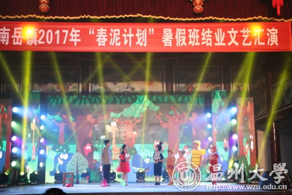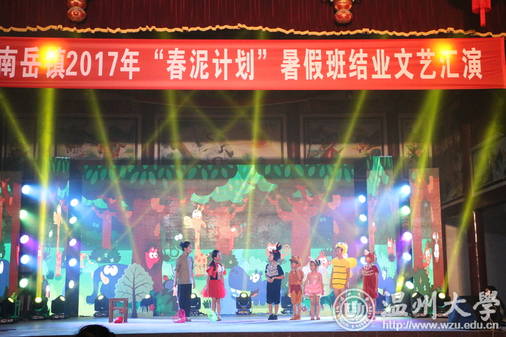 今天晚上,南岳镇春泥计划班结业汇报演出在南岳镇后塘文化礼堂火热上演。幼升小的开蒙礼、合唱、朗诵、舞蹈、越剧、儿童剧、服装走秀等11个形式多样的文艺节目赢得阵阵掌声。这场由南岳小学、南岳后塘校区春泥班孩子呈现的演出,是由亚洲成人 教师教育学院“知心姐姐”暑期实践队的成员编排组织,服装、道具均是出自成员之手。
