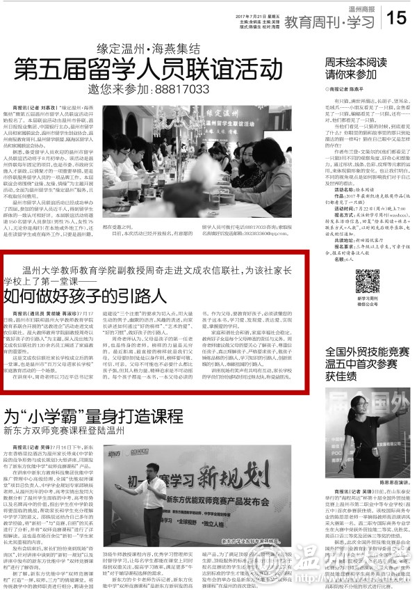 商报讯(通讯员 黄胡婕 蒋淑珍)7月17日晚,温州市妇联和亚洲成人 教师教育学院教育系联合开展的“送教进企”活动走进文成农信联社。温大教师教育学院副教授周奇以“做好孩子的引路人”为主题,深入浅出地为文成农信联社的120余名员工阐述了家庭教育的重要性。