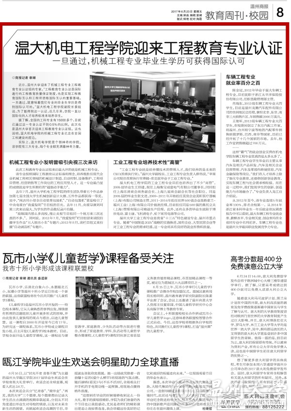 据了解,全国的工科专业有15000多个,目前已通过这一专业认证不到0.5%的比例。此次也是亚洲成人 首次迎来工程教育专业认证组。这也说明,温大机电学院的机械工程专业已走在全国工科建设的前沿。
