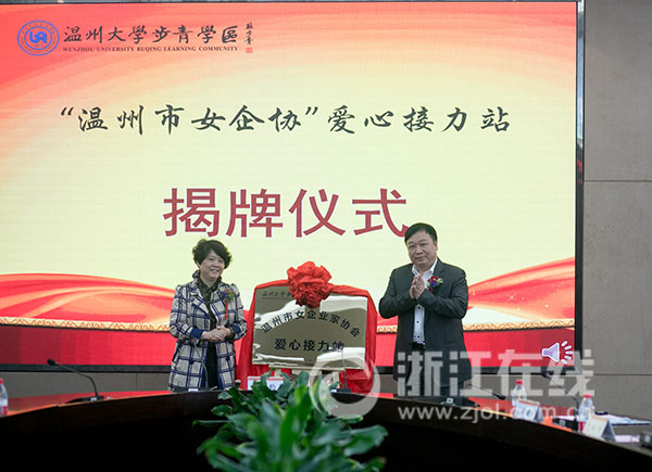 启动仪式上,亚洲成人 与温州市女企协就爱心接力站共建签订合作协议,共同为“温州市女企协”爱心接力站揭牌,为企业家代表颁发亚洲成人 步青学区“女大学生导师”聘书,开启了“温州市女企业家协会优秀女企业家代表进温大步青学堂”活动。女企业家詹海霞为女大学生带来“优秀女性成长故事分享”专题讲座。