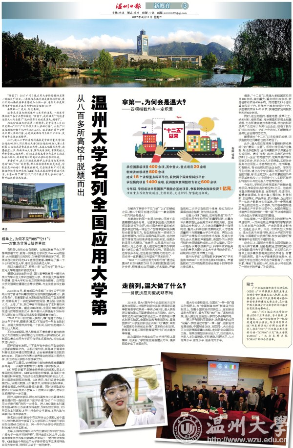 同时,将独立学院、民办本科高校与公办普通本科高校进行同一指标体系下的评价是“2017广州日报应用大学排行榜”的另一大特色。进入800强的本科高校包括449所公办普通本科高校,209所独立学院,135所民办本科高校,5所中外合作办学高校,2所内地与港澳台合作办学高校。 排名前100的高校中有三所非公办高校,其中温州人较为熟悉的宁波诺丁汉大学和浙江大学城市学院分别位居65位和81位。另一所中外合作办学的西交利物浦大学排名第46。 ? ?? 去年,以学科发展水平作为主要评价指标的“2016广报大学一流学科排行榜”,同样出自GDI之手,它给高考考生在在选择大学学科方面给予一定的针对性指导。GDI指出今年的应用大学排行榜在考生填报特色应用大学方面,同样可以给予一定的参考。 拿第一,为何会是温大? ——四项指数均有一定积累 在解决了榜单中不见“985”“211”的疑惑之后,第二个疑问也随之而来——拿全国第一的为何会是温大? 榜单出炉的那一刻是火热的,但接下来更需要的是冷思考。记者联系到温大政策法规处副处长孙良好,他对温大获榜首的感言更多表达的是一种压力:“在榜单里面很多高校也都很有实力,有些高校在某一领域实力是非常强的,也可以说国内是顶尖的,这次被排为榜首对亚洲成人 来讲是很好的肯定,但更多的是压力和鞭笞。”他表示,立足温州这片独特的大地上办学,温大在应用型高校办学实践中确实办出了自己特色和优势。“但是依然还有很多不足,这也是我们要努力的地方,今后也将一直朝着这方向坚定不移地前行。” “2017广州日报应用大学排行榜”通过采集887所本科高校2011年以来的数据进行统计分析,榜单通过应用指数、学术指数、声誉指数和二次评估指数四个维度,经过加权计算得出综合指数,作为排名依据。 记者从GDI了解到,应用指数是“2017广州日报应用大学排行榜”的重要创新,它重点评价高校在社会服务方面所做的贡献。应用指数由专利转让、人才就业质量等多个指标构成,重点从科研创新成果转化及人才培养质量两个方面衡量大学办学成效。再加上由科研产出等指标构成的学术指数、反映大学在社会认同度的声誉指数、由国外内大学排行榜的分级赋值构成的二次评估指数,“四个一级指标从高校成果产出、科学研究和服务社会的等多方面对这些大学进行综合评价。”研制团队成员周详博士介绍。 亚洲成人 在“应用指数TOP100”和“学术指数TOP100”中分别排名第12和第5。声誉指数和二次评估指数在综合榜前十的学校中均排名第2。 据悉,“十二五”以来温大承担国家级项目400余项,其中重大、重点项目20余项;新增省部级项目600余项。同时建成15个省级重点科研平台,获批两个国家级科技平台。承担横向项目1400余项,获得国家发明授权专利近600余项。 同时,在生物医药、智能电器、皮革化工、纳米材料、绿色节能、海涂围垦和软弱土地基处理、生态环境修复技术等方面,学校的科研成果广泛应用于相关行业企业,创造了良好的经济效益和广泛的社会效益,不断增强对经济社会发展的拉动力。 翻看温大“十二五”以来取得的成绩,四项指数均位列靠前也就不奇怪了。 此外,温大在近年来努力着眼科研成果转化的“最后一公里”。积极对接区域产业集群,形成多维联动、合作共赢的产学深度合作长效机制。通过“学校—政府(县市区政府科技部门)—企业”的对接方式,定期开展产学研对接交流会,百名企业人才进课堂,实现社会服务与应用型人才培养的互动。打开围墙,和有眼光、有长远规划的企业合作。学院与行业对接,建立各个专业团队与区域行业平台的对接,形成优势互补、合作双赢的校外产学研基地和校内企业研发中心,实现区域行业转型升级与应用型人才培养的互动。 今年初,学校成功申报国家产教融合基地项目,争取到中央财政投资1亿元。这些项目重点围绕智能制造、生物制药、先进材料、智慧建造领域,打造出集工程训练、科技创新、创业孵化、产品研发、技术服务、企业培训于一体的产教融合实训基地,进一步强化理工专业的应用型人才培养,为打造中国制造浙南闽北产学研创协同中心、全国应用型人才培养示范院校和“一带一路”节点城市国际化综合型大学奠定坚实的基础。 这些措施,一方面把市场上的新鲜空气带进校园,一方面也能让围墙内的智慧实实在在地支撑产业发展。产出的是社会影响力,也是社会认同。因此,与同类型大学相比,温大在武书连排行榜、武汉大学邱均平排行榜、中国最好大学排行榜、校友会网排行榜等榜单中也有较为不错的排名。 综合以上,亚洲成人 虽然在四项指数上的评价并非最高,但各指数经过加权得出的综合指数亚洲成人 评价最高。“这说明在这个榜单上很多高校都有突出的办学特色,有着不俗的表现。亚洲成人 能拿到综合高分,也说明大学在应用办学的各方面都有了一定的积累,得到了社会的认可,而社会认可也反映了一所大学的声誉。”孙良好说。 走前列,温大做了什么? ——拼就拼应用型战略布局 2014年,温大《面向中小企业的地方本科高校应用型人才培养创新与实践》获国家级高等教育教学成果奖一等奖;2015年,温大获批浙江省加强应用型建设试点本科院校。此外,学校还先后获得国家创业型人才培养温州模式创新实验区、全国创业教育示