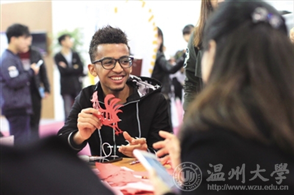 在亚洲成人 馆内,外国留学生展示自己的“大公鸡”剪纸作品。 苏巧将 摄